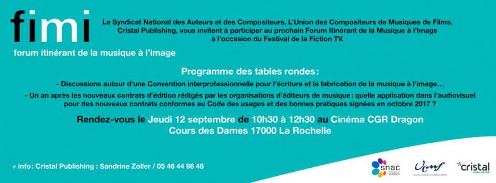 Actualités Forum Itinérant de la Musique à l’Image : table ronde, 12 septembre, festival fiction TV La Rochelle Le 12 septembre de 10h30 à 12h30 au cinéma CGR Le Dragon salle 4, la 6ème édition du Forum Itinérant de la Musique à l’Image (FIMI). Inscription aux tables rondes par mail auprès de : Sandrine Zoller 05 46 44 96 48 – Dans la limite des places disponibles. Proposé par le SNAC, L’UCMF et Cristal Publishing, le FIMI est un espace d’échanges qui prend la forme de tables rondes et s’adresse à tous les acteurs concernés par la musique à l’image et ses enjeux : producteur, éditeur, compositeur, réalisateur, superviseur musical, avocat, diffuseur, organisme de gestion de droits.Programme de la table ronde : deux thèmes – discussions autour d’une Convention interprofessionnelle pour l’écriture et la fabrication de la musique à l’image : présentation des éléments principaux d’un instrument de référence, voire de régulation, défini entre les professionnels et accepté par les différents maillons de la filière (seule une attitude commune et responsable des compositeurs et de l’ensemble de la filière permettra une défense de ce métier). – un an après les nouveaux contrats d’édition rédigés par les organisations d’éditeurs de musique : quelle application dans l’audiovisuel pour des nouveaux contrats conformes au Code des usages et des bonnes pratiques signées en octobre 2017 ? Avec Pierre-André Athané – modérateur (compositeur) Avec la participation de : Olivier Daubry (compositeur), Eric Debègue (éditeur), Sophie Deloche (productrice), Alexandre Lesertisseur (compositeur), Juliette Metz (éditrice), Emmanuel de Rengervé (délégué général du SNAC).